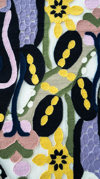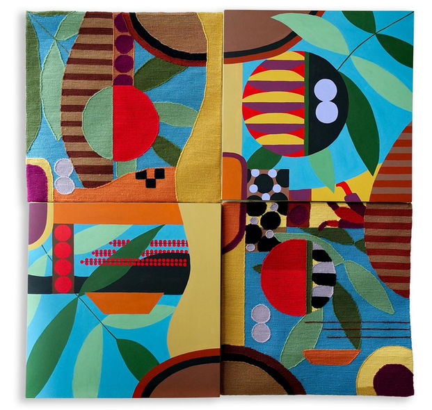 Trabalho com a natureza, em momentos de contemplação e percepção desses espaços fotografo paisagens, formas de plantas, combinações de cores, recolho pedaços, cascas, folhas secas, investigo essas linhas, sugiro novos encaixes, formas e acabamentos. Cada desenho é uma descoberta e novas possibilidades se revelam no processo. Recortes micro e macro da natureza onde espaços meditativos e memórias pessoais se tecem. Na geometria encontrei uma forma de traduzir o complexo, de achar o contorno em experiências vividas e traduzir isso em novas linguagens, seja pintura ou tapeçaria ou as duas juntas, investigando como esses dois materiais interagem e se complementam entre si.